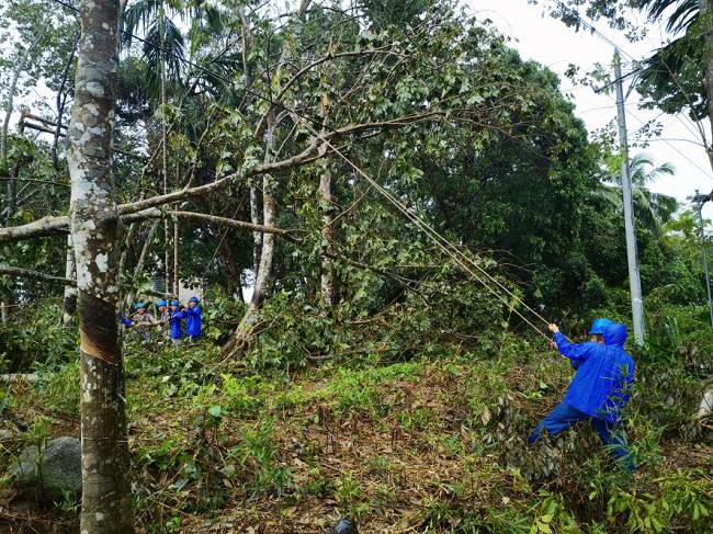 到達(dá)海南后,揭陽明利綜合能源發(fā)展有限公司支援海南抗災(zāi)搶險隊在澄邁縣緊鑼密鼓開展搶修復(fù)電工作。澄邁地貌相對平整,但林區(qū)覆蓋率較高,橡膠林香蕉園廣泛分布,臺風(fēng)摩羯過境后,林區(qū)樹木倒塌壓垮電線,線路損壞嚴(yán)重。為打通線路搶修通道,加快復(fù)電進(jìn)度,公司搶險隊伍一邊組織大型施工機械快速重新組立電桿,一邊組織人員及時消缺搶修,力爭以最快速度恢復(fù)線路正常供電。
